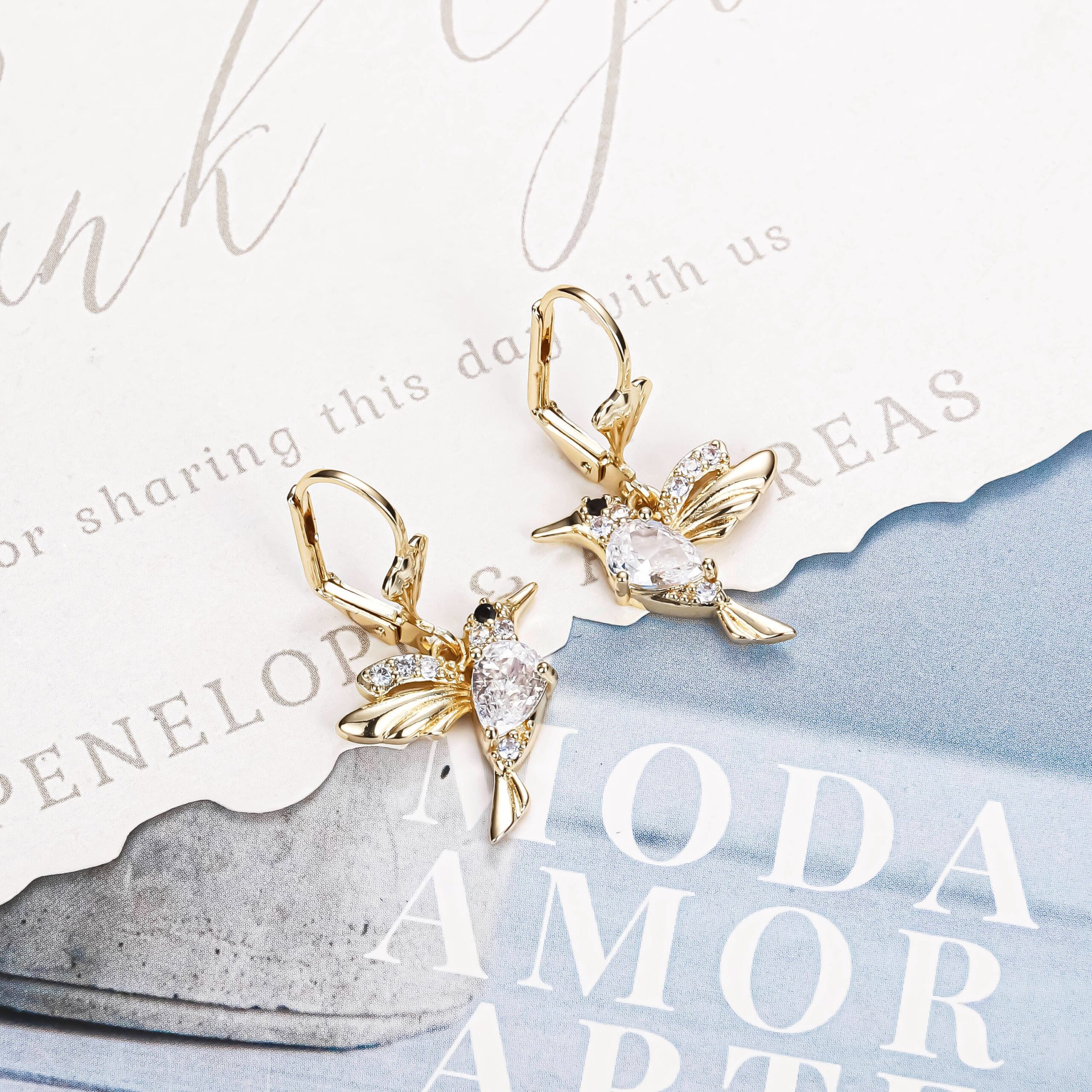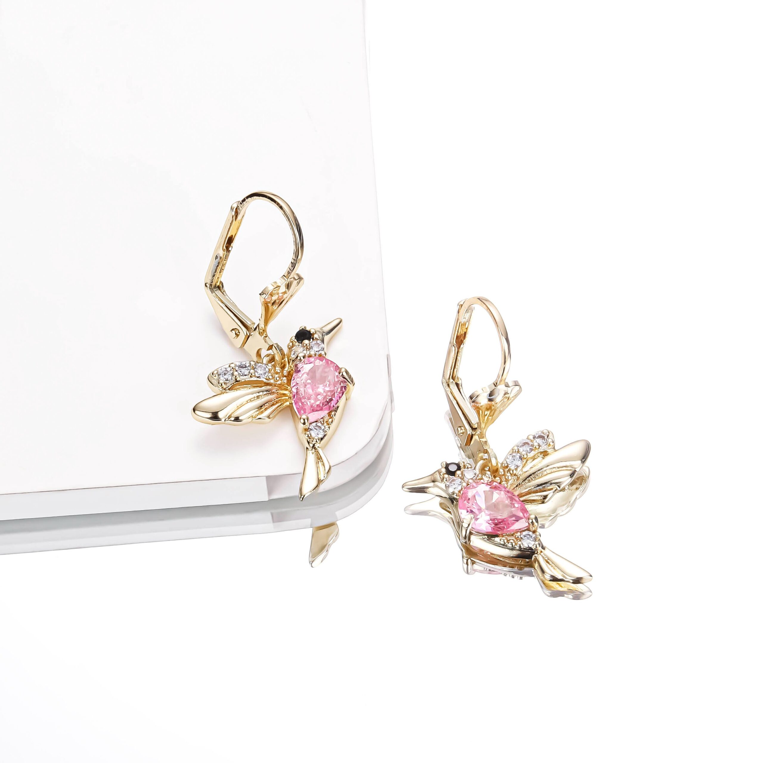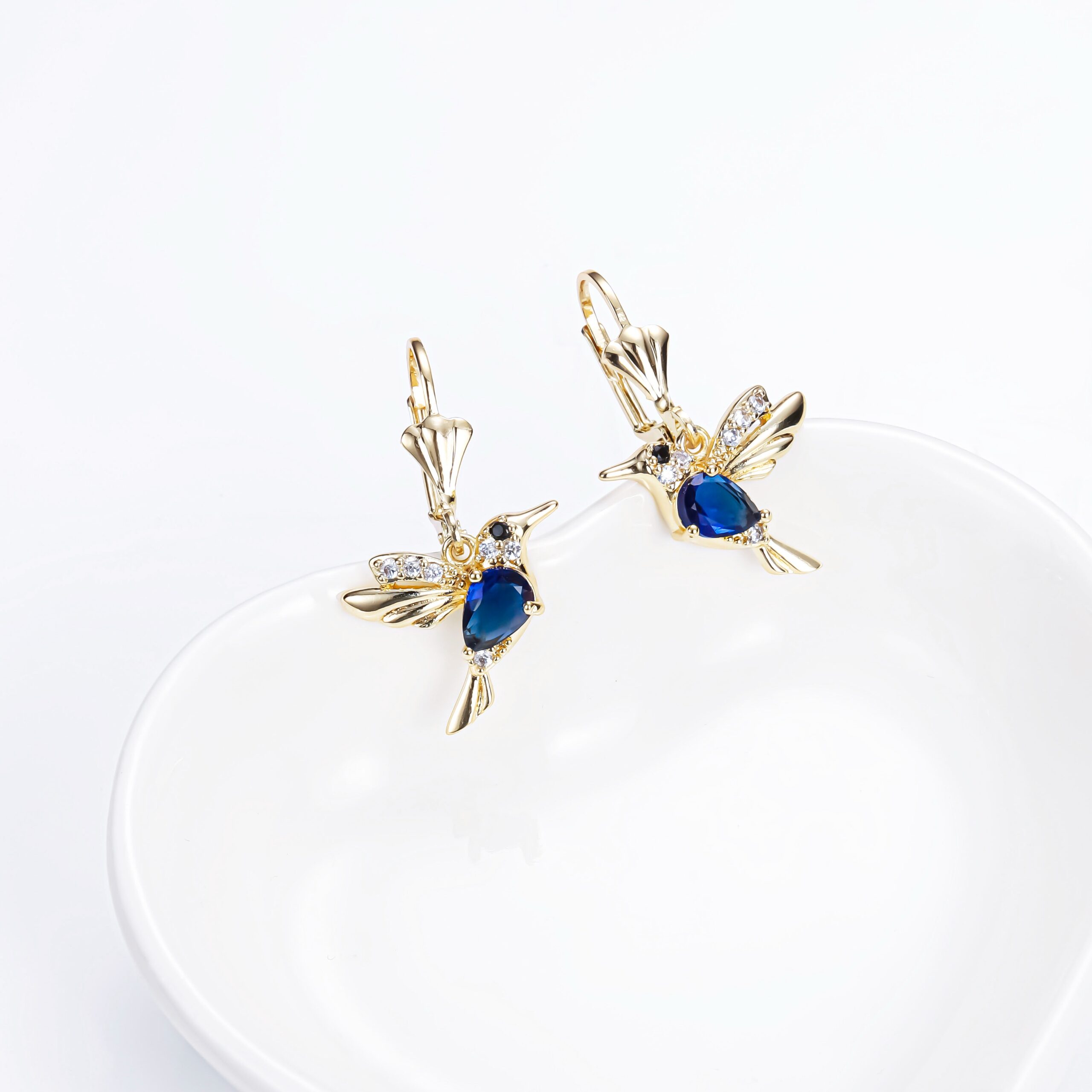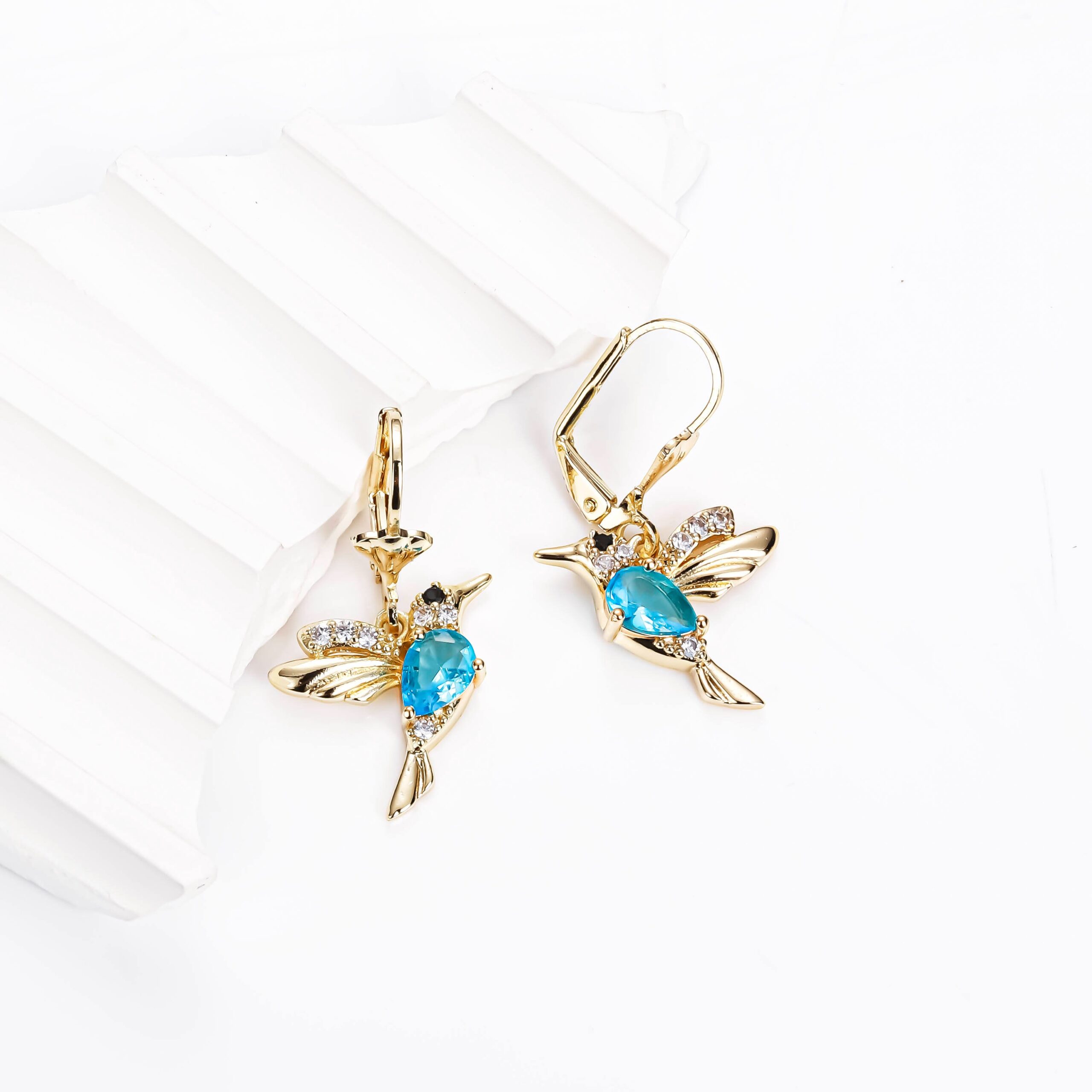14K gold plated hummingbird drop earrings with colored zircon sparkle—minimalist luxury, gift-ready elegance. Shop yours today.
